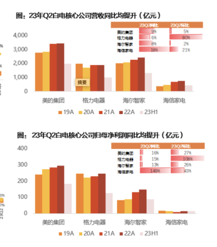 天风证券9月9日研报还提到,今年二季度白电行业恢复明显。中报表现看,白电标的毛销差和净利率变化相对稳定,其中海信家电表现亮眼,23Q2归母净利同比翻倍增长。股债收益率角度,目前家电板块由于高股息、低估值,处在股债收益差的负一倍标准差与均值水平之间,若回归均值水平对应指数12%涨幅空间(对应23年8月8日数据)。