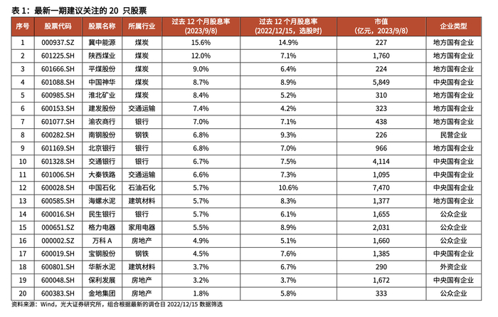 光大证券张宇生在9月9日研报中指出,根据中证红利指数为基准构建的新高股息组合历史数据显示,新组合表现显著优于中证红利指数。高股息板块当前仍然值得关注,因此我们也列示了高股息组合的最新标的,最新一期建议关注的20只股票分别是冀中能源、陕西煤业、平煤股份、中国神华、淮北矿业、建发股份、渝农商行、南钢股份、北京银行、交通银行、大秦铁路、中国石化、海螺水泥、民生银行、格力电器、万科A、宝钢股份、华新水泥、保利发展、金地集团。