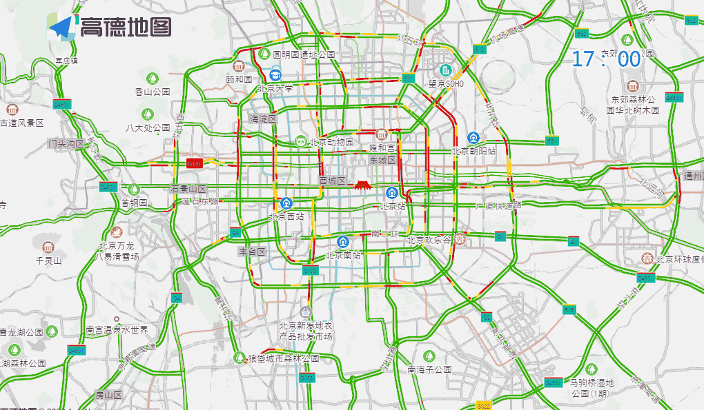 晚高峰期间,东、西、北二、三、四、五环,东六环部分路段,以及万泉河路至圆明园西路、通惠河北路、莲石东路等城区道路出城方向车流集中,京藏高速、京承高速、京通快速、京港澳高速、机场高速等高速公路出京方向车流量大。