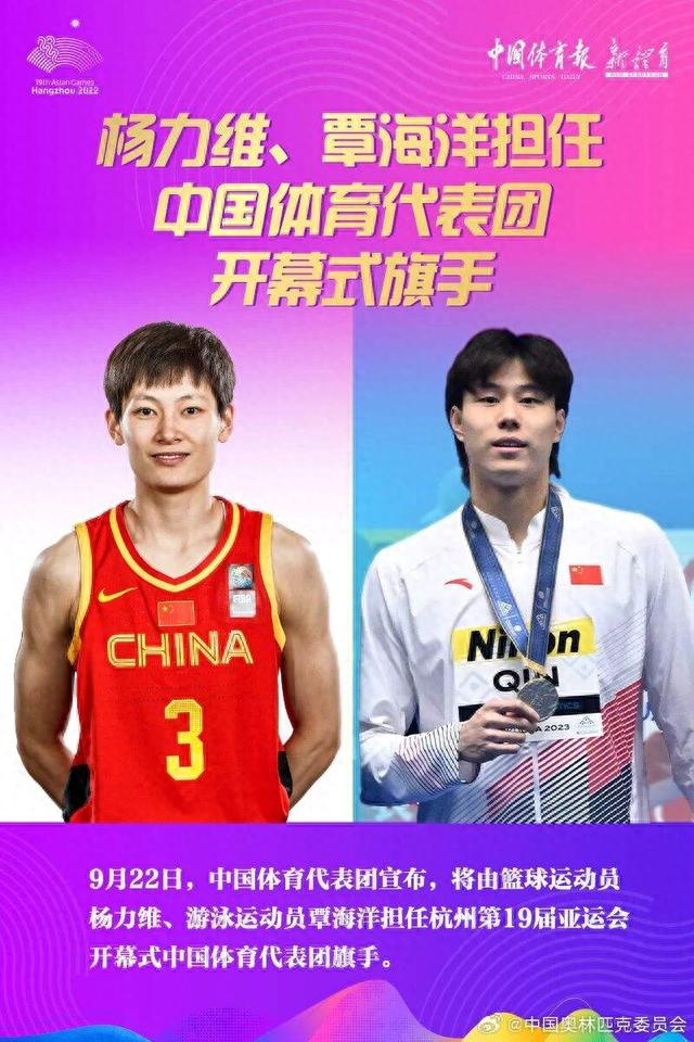 杭州亚运会中国体育代表团9月22日宣布,杭州亚运会开幕式中国体育代表团旗手将由男子游泳运动员覃海洋和女子篮球运动员杨力维担任。得知消息后,昆明姑娘杨力维感到“很惊喜,很荣幸,非常激动”,旗手为什么是她?记者随后的采访给出了答案。