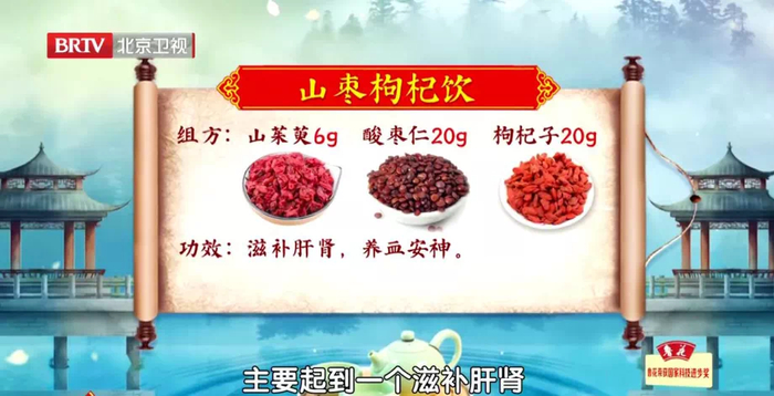 山茱萸补肝肾,温性,但由于味道较酸,不宜多放。酸枣仁性平味酸,养血安神。枸杞性平,补肾精。