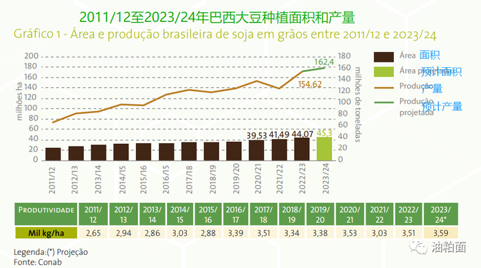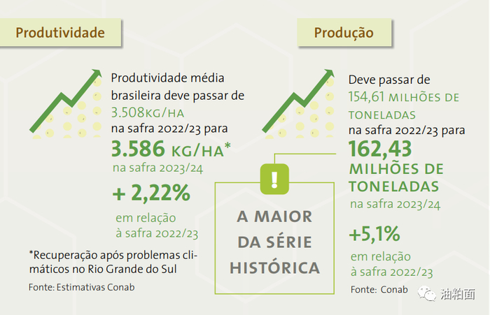 Conab在其《2023/24农业展望》中估计,2023/24年巴西大豆产量将创下1.624亿吨的新纪录,或增加5.1%,即780万吨。2023/24年度大豆种植面积预计为4530万公顷(1.118亿英亩),增长2.8%。