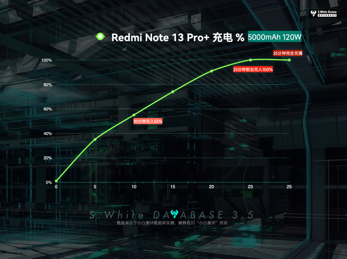 充电实测:120W充电功率,25℃标准测试环境中,10分钟充入电量55%,23分钟前台充入100%(实际充入94.89%),25分钟完全充满。