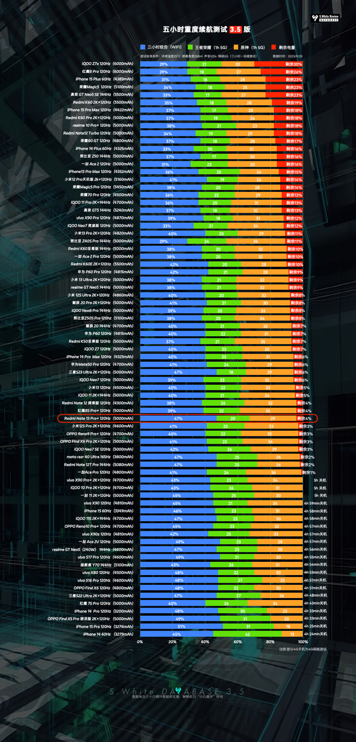 续航实测:5000mAh电池,2712*1200分辨率,120Hz刷新率,三小时轻度续航模型测试电量剩余53%,五小时重度续航测试剩余4%,极限续航测试直到关机,Note 13 Pro+共坚持5小时18分钟;