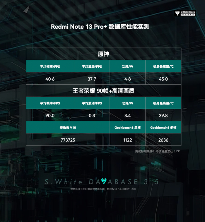 以上基于小白测评数据库3.5模型测试,测试标准条件:环境温25℃±0.5℃,屏幕亮度350nit,声音50%(5小时重度续航、极限续航测试:性能模式)(数据基于 Redmi Note 13 Pro+ 测试时最新版 MIUI 14.0.1(TNOCNXM) 系统测试)