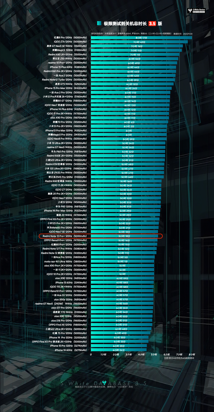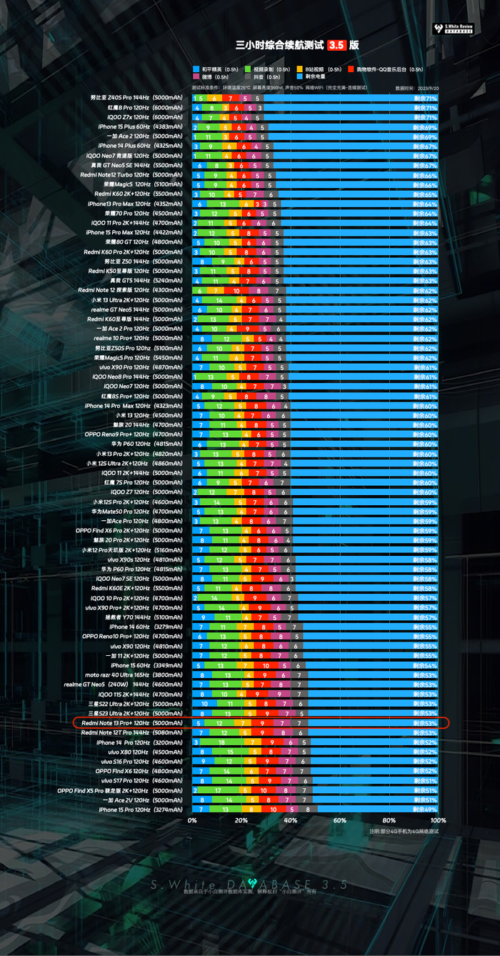 需要强调:续航模型为较高强度连续测试,每个用户的使用习惯不同,小白测评数据库尽可能同一变量、用固定模型统一测试(前3小时为插卡WiFi下测试、三小时后使用流量测试),为大家提供参考。具体用户实际使用表现视个人习惯而定。关于小白测评数据库3.0测试模型细节可以在微信公众号后台回复「数据库测试手册」进行查阅,更多新机多项实测数据及部分机型复测数据,小程序均会首发更新,所有数据一切以小程序为准,大家可进入小白测评数据库 收藏并免费查看。