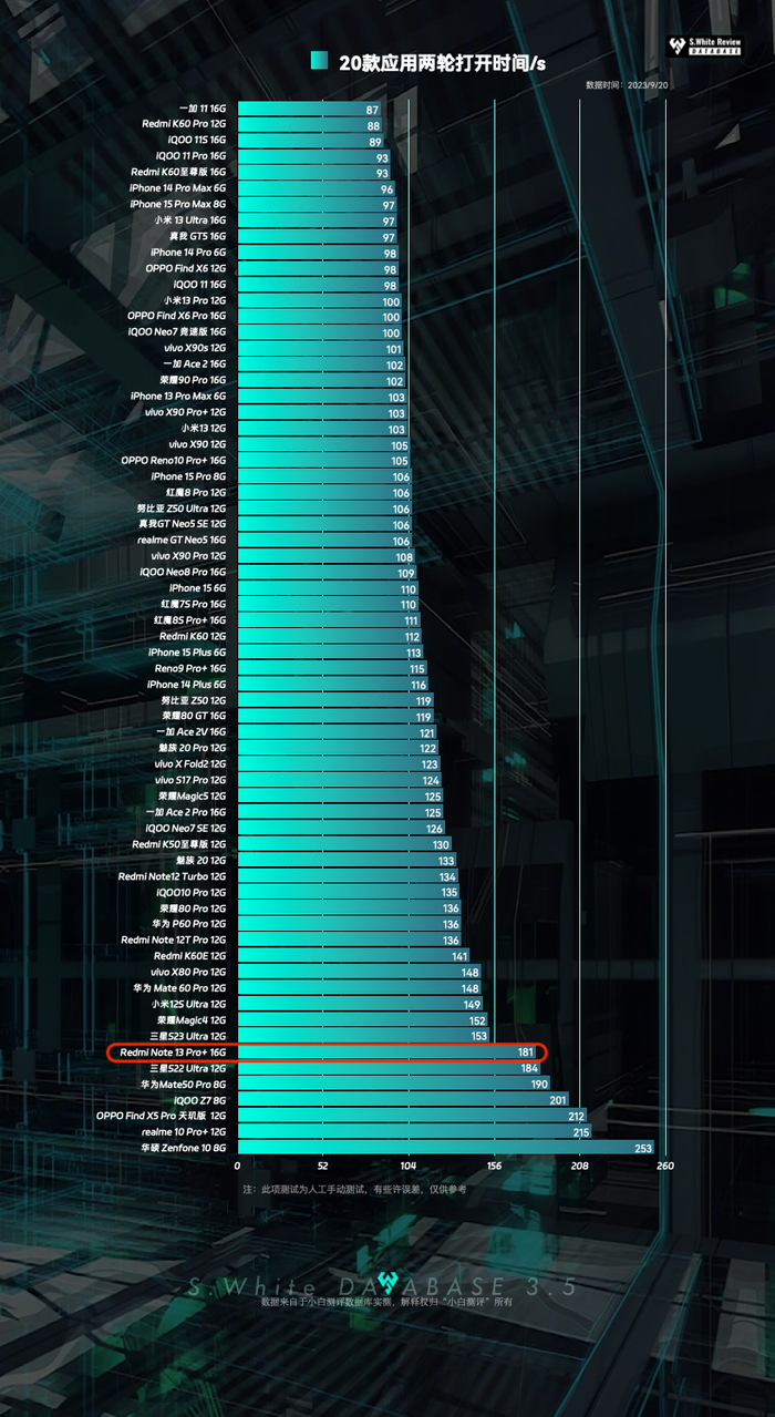 综合体验上,20款应用两轮打开用时181秒,第二遍打开杀2个后台。(此项测试为人工手动实测,仅供参考,测试版本:16GB+512GB)