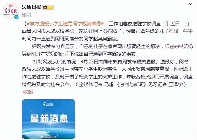 针对网友反映的情况,9月23日大同市教育局发布相关通报。通报称,网络反映大成双语学校发生同寝室小学生欺辱事件,大同市教育局高度重视,连夜派工作组进驻学校,及时开展了相关学生的关护工作,并联合相关部门开展调查,调查情况将及时向社会公布。(全媒体记者 马超 《法制与新闻》见习记者 王泽宇)