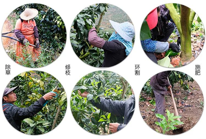每年6月,农户们一起为小柚子套上保护袋,这样避开蚊虫叮咬、鸟类侵袭、风雨影响、更好地保证了红心蜜柚的品质。