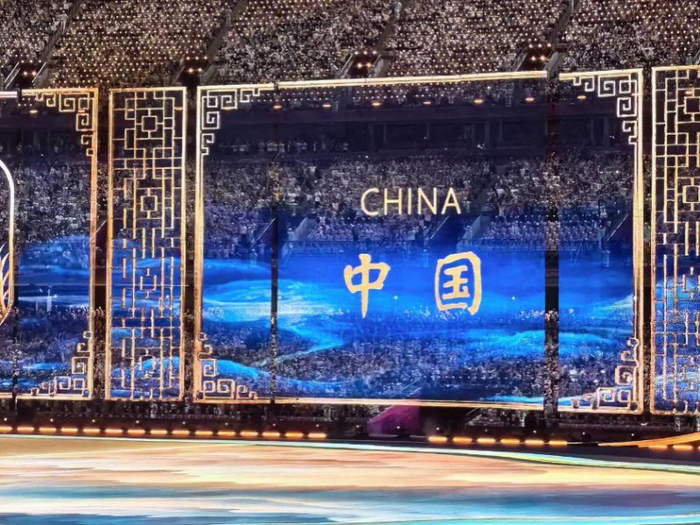 运动员入场时,地屏之上勾勒出团扇造型,各式各样的江南元素与景象浮现其中。网幕上, “梅兰竹菊”的主题之窗尽展典雅、吉祥之意。窗中,西泠印社的书法字体隽永飘逸,以中华笔触抒写亚洲风采,以独特的江南韵味迎接运动员入场。“桂花鼓”激昂奏响,寄托着美好的祝福,为各代表团运动员助威加油。