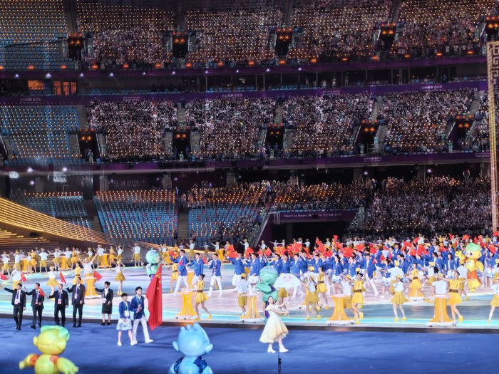 中国体育代表团作为压轴,在运动员入场仪式上最后出场。其中,作为旗手,游泳运动员覃海洋、篮球运动员杨力维走在中国体育代表团方阵最前列。据了解,本届亚运会中国体育代表团总人数1329人,运动员886人,包括了36名奥运冠军。共有67人参加过里约奥运会,201人参加过东京奥运会,226人参加过2018年雅加达亚运会,630人为第一次参加亚运会。中国体育代表团将参加除卡巴迪、板球以外的38个大项、407个小项的比赛。