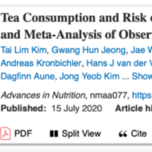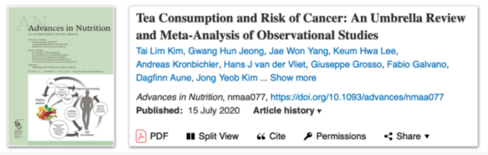 2020 年发表在《营养学进展》上的一项研究发现:喝茶真的可以预防癌症,尤其是口腔癌。虽然饮用各种茶与胃癌、结直肠癌、胆道癌、肝癌等多种癌症的风险降低有关,不过关键证据仍不够充分,但饮茶与口腔癌风险降低之间的关系有充分证据![1]