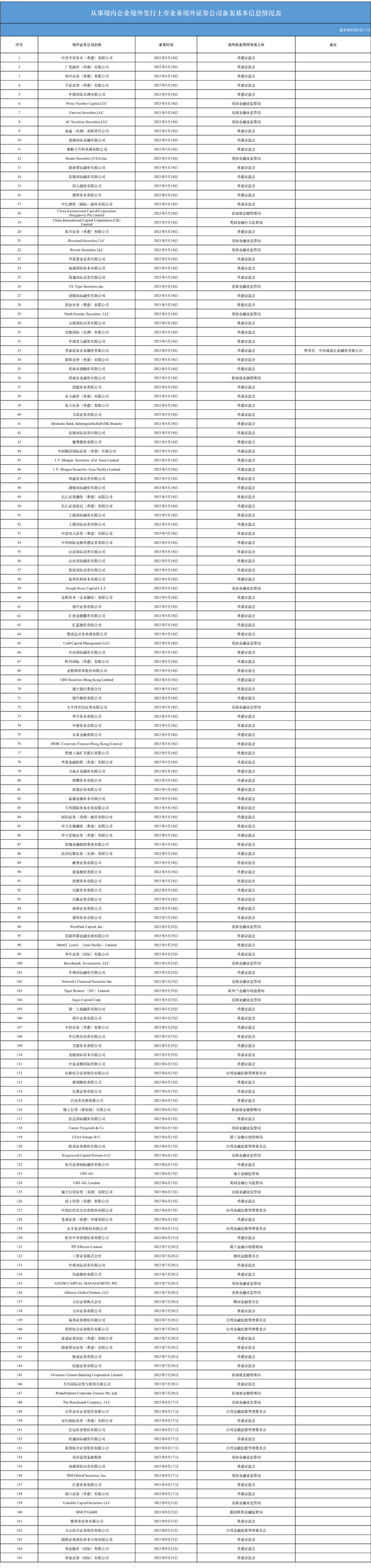 中国证监会:165家券商备案,境外证券公司备案信息公示表(截至9.21)