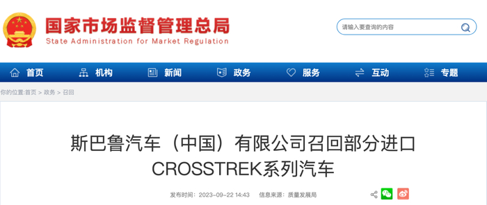 日前,斯巴鲁汽车(中国)有限公司根据《缺陷汽车产品召回管理条例》和《缺陷汽车产品召回管理条例实施办法》的要求,向国家市场监督管理总局备案了召回计划。自2023年10月8日起,召回2023年5月19日至2023年6月6日期间生产的部分进口CROSSTREK系列汽车,共计447辆。