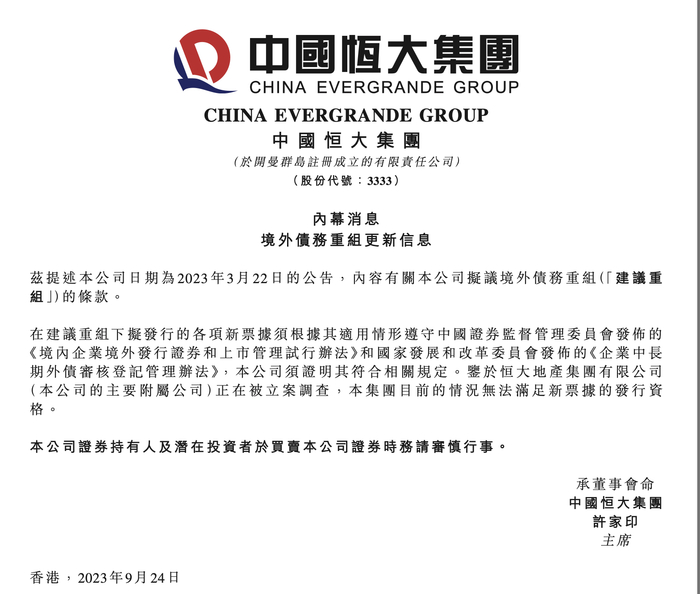 9月24日,中国恒大(3333.HK,股价0.55港元,市值72.62亿元)公告称:鉴于附属公司恒大地产集团正在被立案调查 ,集团目前的情况无法满足新票据的发行资格。