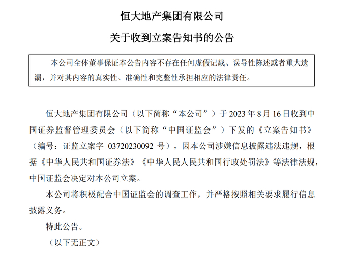 8月16日晚21时,恒大地产集团有限公司(以下简称恒大地产)在深交所发布公告,称收到中国证监会下发的《立案告知书》,因公司涉嫌信息披露违法违规,根据《中华人民共和国证券法》《中华人民共和国行政处罚法》等法律法规,中国证监会决定对恒大地产立案。