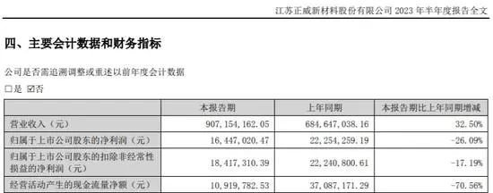 今年上半年,正威新材“增收不增利”,在实现营收同比增长32.5%的情况下归母净利润同比下降26.09%,公司经营活动产生的现金流量净额也由去年同期的3708.72万元骤降至1091.98万元,降幅70.56%。