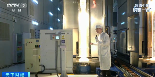 散发着强光的装置就是光纤的拉丝炉,炉内温度高达2000摄氏度,生产光纤就像是做“拉丝糖”,要先将固体预制棒熔融软化,然后通过牵引力拉成细丝。