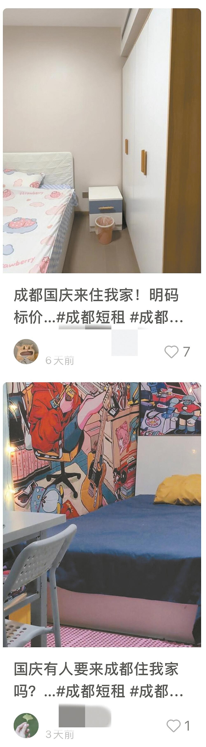 社交平台发布的这些信息中,还包括房屋的位置、价格等内容。“成都东客站附近,近地铁300米,日租100一天,不包含水电,一个人头多交10块钱水电费,客厅用完收拾干净就行”“套一:独立卧室、客厅、卫生间。地理位置:近成都五根松地铁站。5天以上租180元/天,5天以下租220元/天。”“由于本人国庆回老家,整租套二,在成都市新都区兴城大道附近,短租时间:9月27日—10月7日,199元/天。”