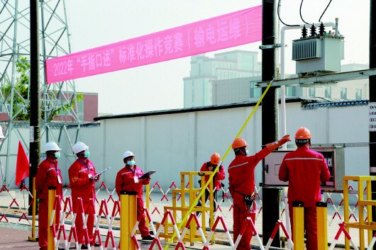 在2022年“手指口述”标准化操作(输电运维)竞赛现场,员工正在展示动作指向、口令演练。