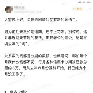 随着时间推移,2022年,陈蔓蔓经常刷到社群里各种关于负债清理的内容。当我在社群里搜索“负债”标签,除了一本“躺平负债两百万元”的日本心灵鸡汤书籍,还看到很多人的负债清理内容。不少人在拆东墙补西墙后逐渐发现,每个月的还款总额已经超出还款能力,随之而来是巨大的恐惧,头脑发蒙、四肢无力,各种评判的声音从四面八方冒出来。