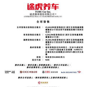 途虎养车香港IPO发售价定为每股28港元 募资净额约10.81亿港元