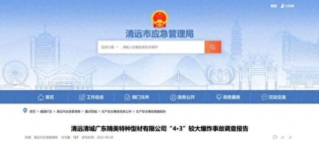 近日,广东省清远市应急管理局公布了《清远清城广东精美特种型材有限公司“4·3”较大爆炸事故调查报告》。
