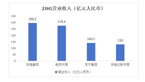 但好在整个市场都在向上,截至8月底,国内知名运动品牌均发布23H1业绩,据市界统计,六大体育运动品牌共创收949.94亿元,其中国产品牌安踏、李宁的营收和更是超过400亿大关,而安踏更是凭借上半年优异的表现,持续了2022年的高光表现——超越NIKE,坐稳了国内“一哥”的地位。