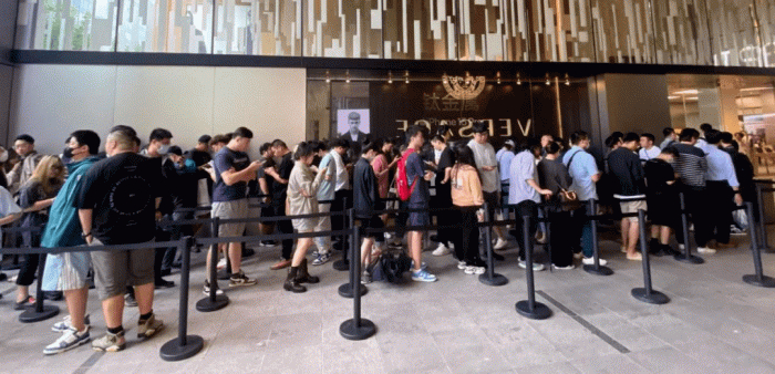 上午九点半,直营店开售一个半小时后,现场一位黄牛说:“今年行情不好,马上得走了,不然就亏了,行情跌得太快了。”十点左右,店门口已经有不少黄牛陆续离开。
