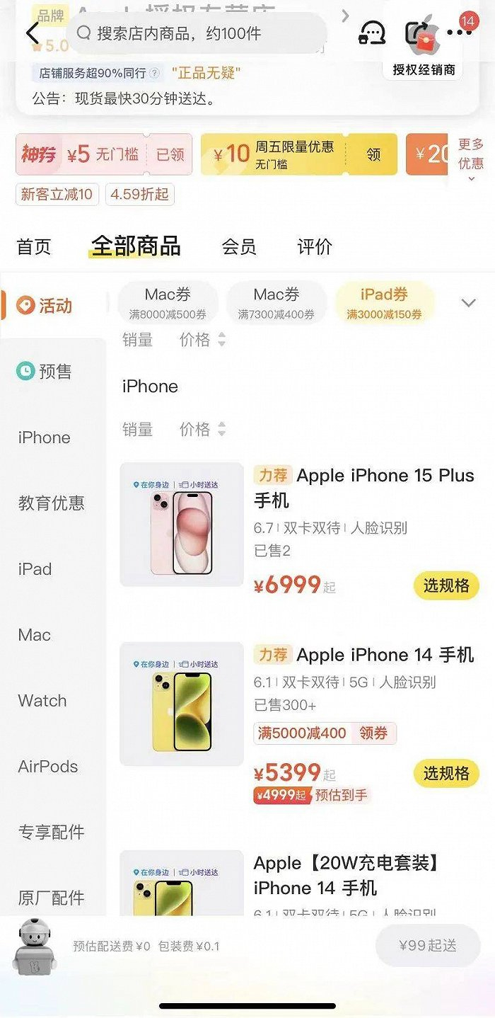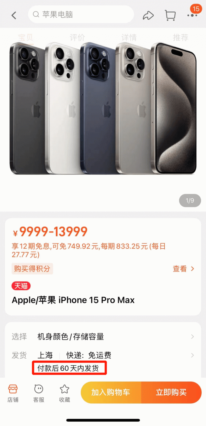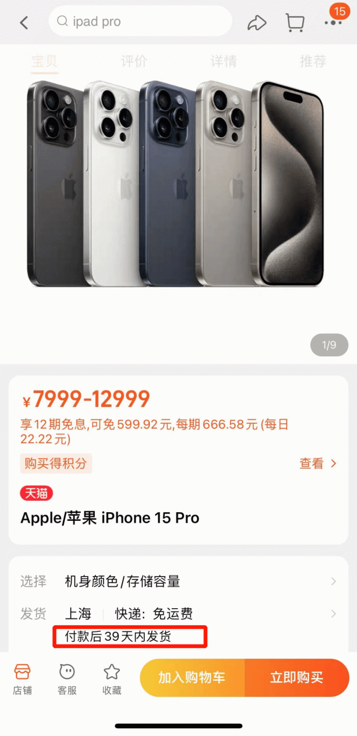 在拼多多上,iPhone15系列参加百亿补贴活动,起步价5598元,比原价直降400元左右。记者注意到,全网都需等待近一个月的Pro机型,拼多多目前仍可以购买,且购买页面显示“9月28日发完”。