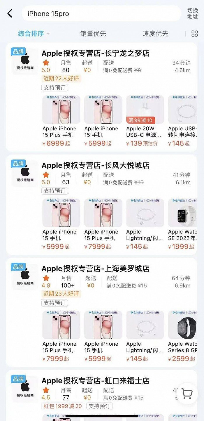 美团、饿了么上仍有现货,但仅有iPhone15标准版和Plus版可供购买。