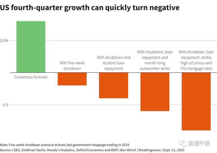 其他地方也在聚集乌云。福特汽车、通用汽车和Stellantis罢工的美国汽车工人联盟(UAW)和他们的雇主之间几乎没有取得进展的迹象。咨询公司RSM告诉路透,如果停工持续一个月,经济产出将再减少0.2个百分点。