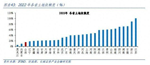 我们以成交土地出让金占地方公共财政收入的比例来近似衡量土地依赖程度,从2022年数据来看,山西省的土地依赖度居30省(除西藏外)的较低水平,事实上近10年以来其土地依赖度都明显低于30个省市的平均水平。
