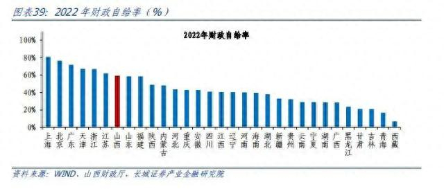 我们以一般公共预算收入占支出的比例大致衡量财政自给率,山西省财政自给率自2015年以来震荡上行,2022年财政自给率上升至58.8%,排全国第七位,财政自给能力并不弱。同时山西对中央转移支付的依赖也不高。2020年到2021年,全国23个省市获得中央净转移(净上缴中央税收[2]为负),其中山西省2020、2021年分别获得中央净转移约1019和699.9亿元,处于23省偏低水平。2021年山西获得净转移规模占山西省当年一般公共预算收支缺口的31.6%,占比也较低。