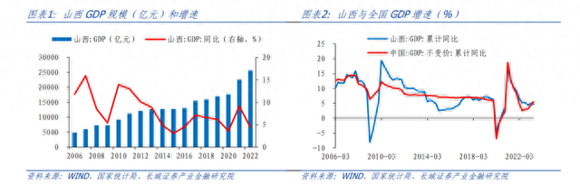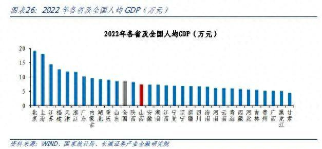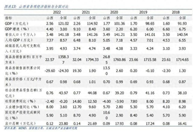 山西历史源远流长,新世纪以来以“能源大省”著称,煤炭产业规模领先全国。经历了21世纪初的煤炭"黄金十年",2013年以来随着供给侧改革大力推进,山西省整体经济发展动能偏弱,经济增速不及全国。国家统计局数据显示,2013年-2022年山西省平均GDP增速为5.8%,低于全国同期的6.2%。2022年山西省经济总量为2.56万亿元,在全国31个省排第20位;从人均生产总值来看,2021年山西人均GDP为7.4万元,居全国第13位,略低于8.6万元的全国人均GDP水平。