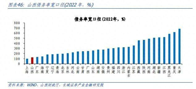 将城投债余额也纳入债务后,山西省宽口径债务率也低于全国平均水平,反映出山西省的隐性债务负担也较轻。2022年山西省宽口径债务率约为125.4%,在31个省市中处于偏低位置,仅高于上海。