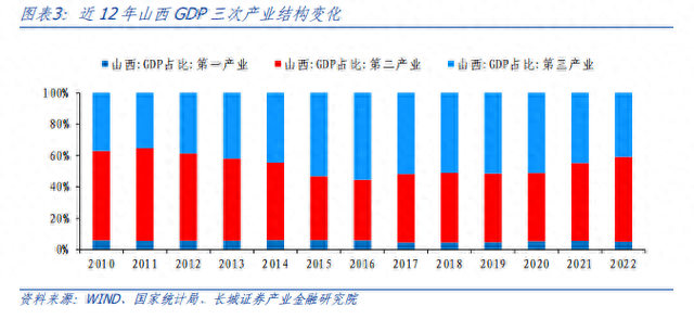 2022年山西省三次产业结构为5.2:54.0:40.8,与全国三次产业比重的7.3:39.9:52.8相比,二产占比明显高于三产,山西省统计局指出,其2023年上半年二产占比排全国第2位,三产占比排全国30位,仅高于内蒙古,"二三一"的产业结构特征突出。实际上近十年来山西省第二产业占比先下降后回升,2016年第二产业占比达到阶段性低点的39%,"供给侧改革"去产能成效显著,之后二产占比重新回升。
