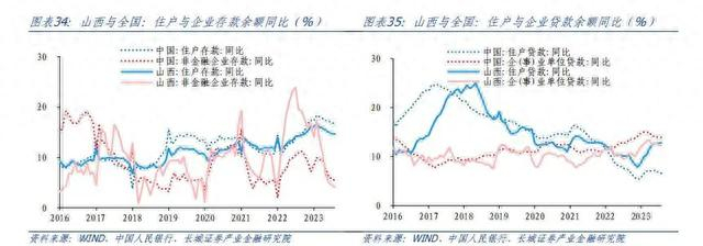 为了分析山西净存款的涨跌,我们进一步从存款和贷款两个角度拆分。2013-2021年,山西省存、贷款有两个特点,一是贷款强、存款弱,贷款增速绝大多数时间明显高于存款增速;二是存贷款增速均不及全国,尤其是2014-2016年,全国存款增速整体回升的背景下,山西省存款增速反而不断走低。这或许是由于2015年前后山西省煤炭等行业去产能,GDP增长大幅减缓,资金供需两端均受到一定冲击。