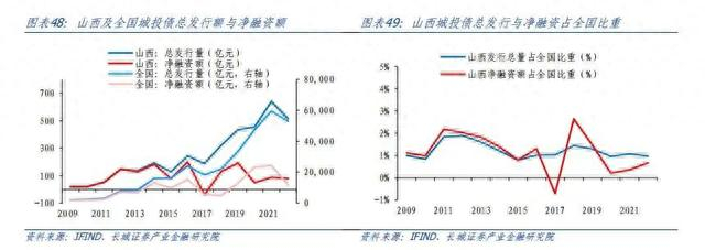 2017年至2022年,山西和全国城投债票面利率均处于下滑势态,整体变动趋势相似。2023年二者有所回升,2023年前9月(截至2023年9月13日)全国城投债票面利率平均约为4.22%,较2022年回升39BP,山西省城投债票面利率4.14%,较2022年回升19BP。值得注意的是,自2018年以后,山西省城投债发行利率逐渐从高于全国水平转为与全国水平持平甚至更低。