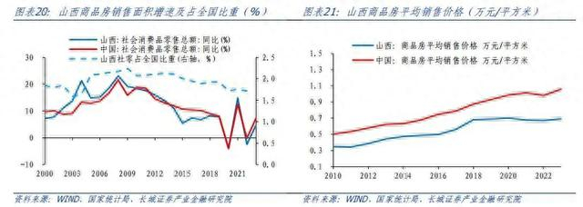 对于商品房销售,山西销售面积增速略快于全国。2013年-2022年,山西省商品房销售面积平均增速为5.4%,远高于全国同期水平(2.8%);占全国的比重也从2013年的1.3%提高到2022年的1.7%。山西省商品房价格一直低于全国水平,上涨速度也偏慢。2022年,全国商品房平均销售价格回落3.2%至9814元/平方米,而山西房价小幅下降0.9%至6713元/平方米,明显低于全国均价。