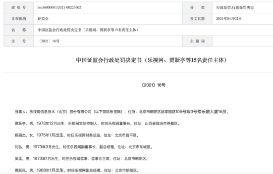 2021年4月,乐视网公告称收到证监会《行政处罚决定书》。证监会指出,乐视网因2007年至2016年十年财务造假,其报送、披露的IPO相关文件及2010年至2016年年报存在虚假记载,未按规定披露关联交易,未披露为乐视控股等公司提供担保事项,未如实披露贾某芳、贾跃亭向上市公司履行借款承诺的情况,2016年非公开发行股票行为构成欺诈发行等违法事实,证监会对乐视网、贾跃亭等15名责任主体作出行政处罚,其中对乐视网罚款2.4亿余元,对贾跃亭罚款2.41亿余元。
