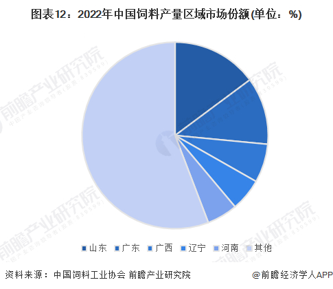 从区域竞争格局看,2022年,中国饲料产量排名前5的省份为山东、广东、广西、辽宁和河南,占全国饲料总产量的比例均在5%以上。其中,山东2022年饲料产量全国第一,占总产量的15%。