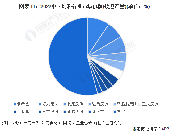 2022年,新希望集团饲料产量达到2822万吨,占全国饲料产量的9%,位列行业第一。海大集团和牧原股份饲料产量均超过2000万吨,占全国饲料产量的6%以上,进入行业前三。温氏股份、双胞胎集团、正大股份等企业的饲料产量也处于行业领先水平。前十大企业产量占比合计达到全国总产量的45.69%。