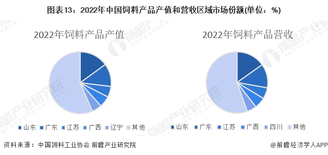 2022年,山东和广东饲料产品产值超过1000亿元,占全国饲料行业总产值的比例分别达到14%和13%。除山东和广东两省,江苏、辽宁和四川饲料产品产值排名第3至第5。饲料行业营收规模方面,2022年山东、广东、江苏和四川依然保持领先,其中山东省位列行业第一,广西进入行业前5。