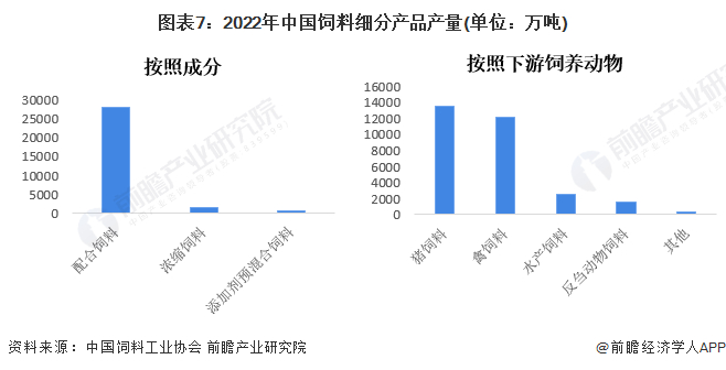 从行业细分产品产量看,2022年中国配合饲料的产量达到28021.2万吨,在配合饲料、浓缩饲料和添加剂预混合饲料中产量最高;从饲料动物角度划分,2022年猪饲料产品产量排名第一,其次是禽饲料。