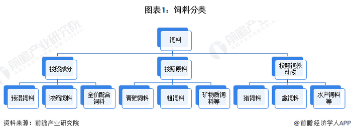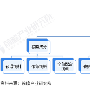 饲料按照成分可以分为预混饲料、浓缩饲料和全价配合饲料。按照原料可以分为青贮饲料、粗饲料、矿物质饲料、维生素饲料等。按照饲养的动物可以分为猪饲料、禽饲料、水产饲料、反刍饲料等。