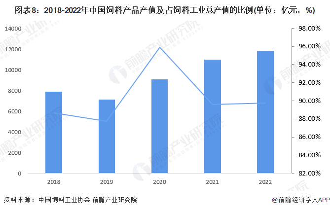 2018-2022年中国饲料产品产值呈现先下降后上升趋势。2019年,中国饲料行业产品结构调整加快,行业产值暂时下降。2020年中国饲料行业产品产值恢复增长,2021年突破1万亿元,2022年饲料行业产品产值规模达到1.18万亿元,同比增长7.8%,占饲料工业(饲料产品和饲料添加剂)总产值的90%。