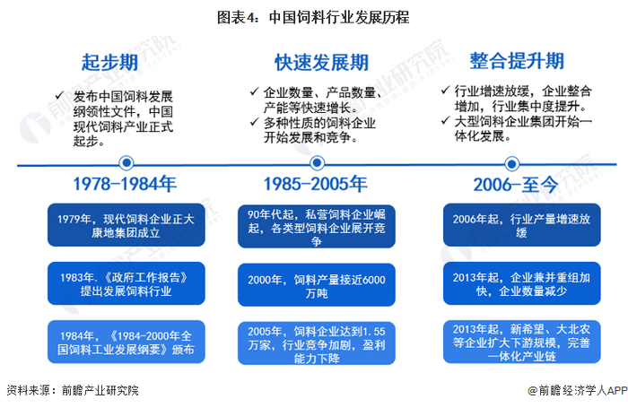 中国现代资料产业从无到有主要经历了三个阶段:起步期、快速发展期、整合提升期。1984年,《1984-2000年全国饲料工业发展纲要》的颁布意味着中国现代饲料行业正式起步。随后,各类型饲料企业开始增长,饲料产能、产量提升较快。到2000年,中国饲料产量已经接近6000万吨,是1978年产量的19倍。2005年,行业产量持续增长,企业数量已经达到1.55万家,大量的企业涌入带来激烈的竞争,行业盈利能力下滑。2006年以来,饲料产量仍在增长但增速开始下降,为寻求突破,行业进入整合发展阶段。部分企业开始兼并重组,企业数量逐渐减少。大型企业加快布局下游养殖业,逐渐完善“饲料-养殖-食品供应”产业链。新希望、大北农等龙头逐渐脱颖而出,行业集中度提升。