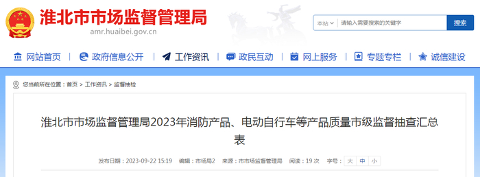 中国质量新闻网讯 9月22日,安徽省淮北市市场监督管理局网站发布2023年消防产品、电动自行车等产品质量市级监督抽查结果。