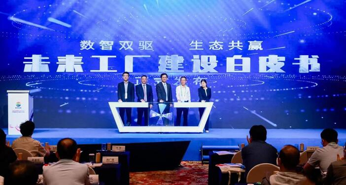以打造数智双驱下的生态共赢,本次论坛还举行了未来工厂建设白皮书的发布仪式,兴发集团研发总监、副总经理刘畅,中石油广东石化科技发展部主任张元礼,华谊集团智造中心副总监戴永明,中控技术董事长兼总裁崔山,中控技术高级副总裁郭飚上台共同开启发布。